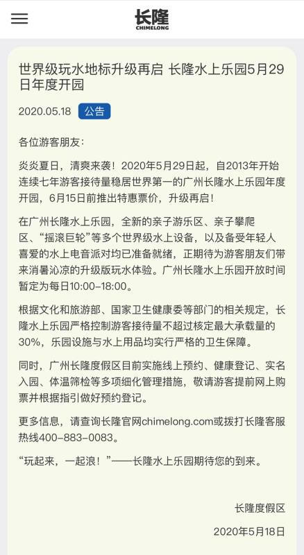 2020年5月29日起,廣州長隆水上樂園將開園,廣州日報記者了解到,長隆水上樂園每年都會階段性開園,一般都會喺4月份開園,10月份閉園。今年因為疫情緣故,比往年推遲開園。