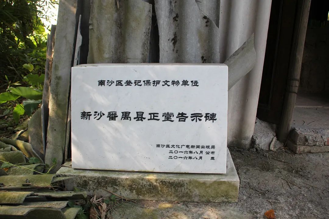 “新沙番禺县正堂告示碑”立于清光绪六年(1880年),现存于新沙村委会,碑体用花岗岩打磨,呈长方形,高1.83米,为一场“民告官”胜诉案件的纪念留存。