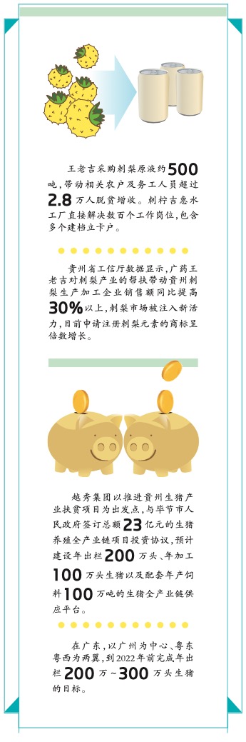 98天开发出畅销新品、发放2亿元扶贫消费券、散卖农产品经包装打磨后身价翻倍......以广药集团、越秀集团为代表的广州本地龙头企业,各自开动脑筋、全力投入并发挥专长优势,力促对口帮扶地区打造特色产业品牌,帮助当地贫困户实现“高质量脱贫”。