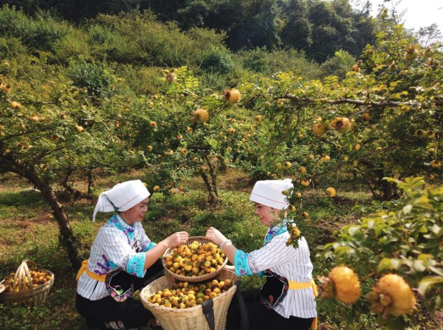 贵州姑娘采摘刺梨。仅凭借种刺梨,黔南龙里县茶香村大多数人甩掉了“贫困户”帽子。今年47岁的文叔2002年因为一次事故不能再干正常的体力劳动,一家顿时成了贫困户。现在,文叔不断扩大刺梨种植面积,40亩的地年收入能达到五六万元,他修了楼房、换了60吋彩电,前不久还给儿子娶上了媳妇。