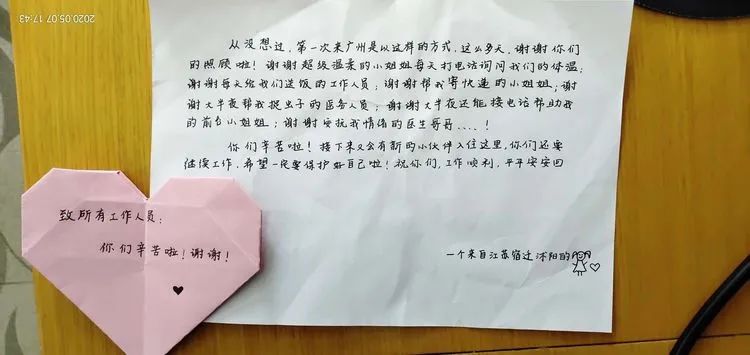 一个多月的驻定点酒店工作里,入住的旅客对黄志安以及驻点团队和酒店的贴心服务都纷纷表示满意和称赞,一名回国的入境旅客说“黄组长,非常感谢这段时间您的帮助。”一名回国的小女孩在感谢信上写道:“这么多天,谢谢你们的照顾啦!谢谢超级温柔的小姐姐每天打电话询问我们的体温;谢谢每天给我们送饭的工作人员;谢谢帮我寄快递的小姐姐;谢谢大半夜帮我捉虫子的医务人员;谢谢大半夜还能接电话帮助我的前台小姐姐;谢谢安抚我情绪的医生哥哥……”还有入境旅客为了感谢工作人员,向驻点团队和酒店工作人员赠送了奶茶、kn95口罩等小礼物,表示日后一定会回番禺玩的。