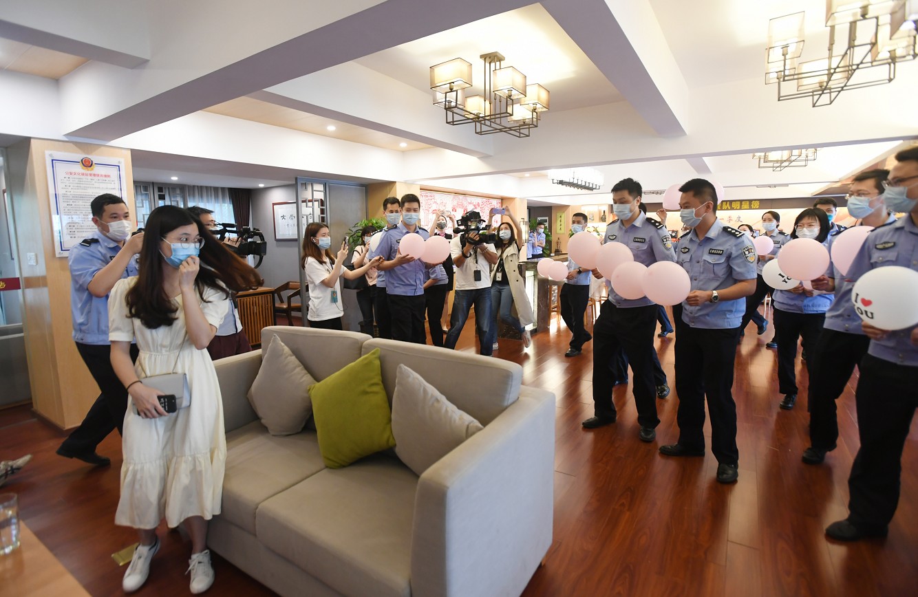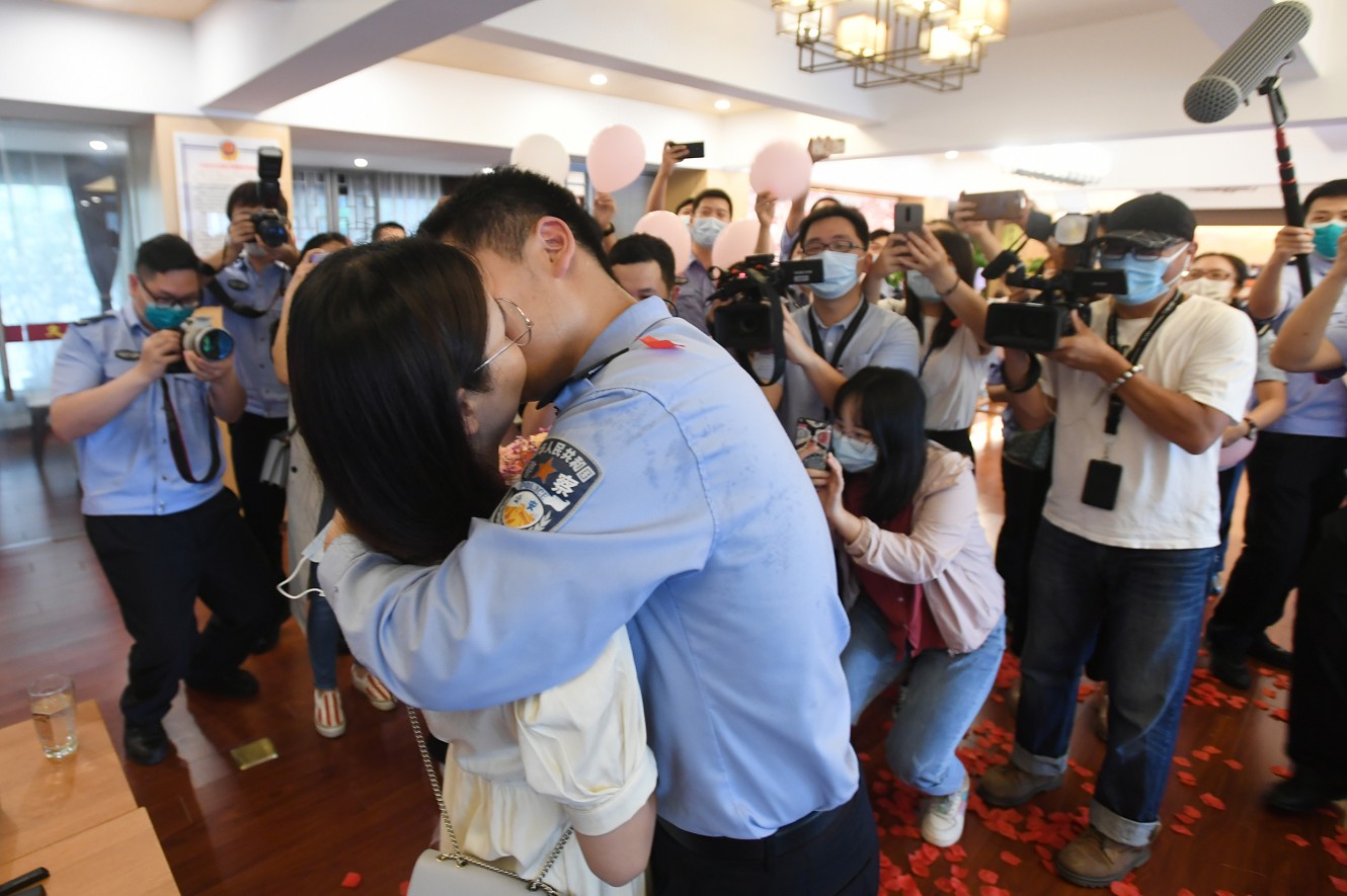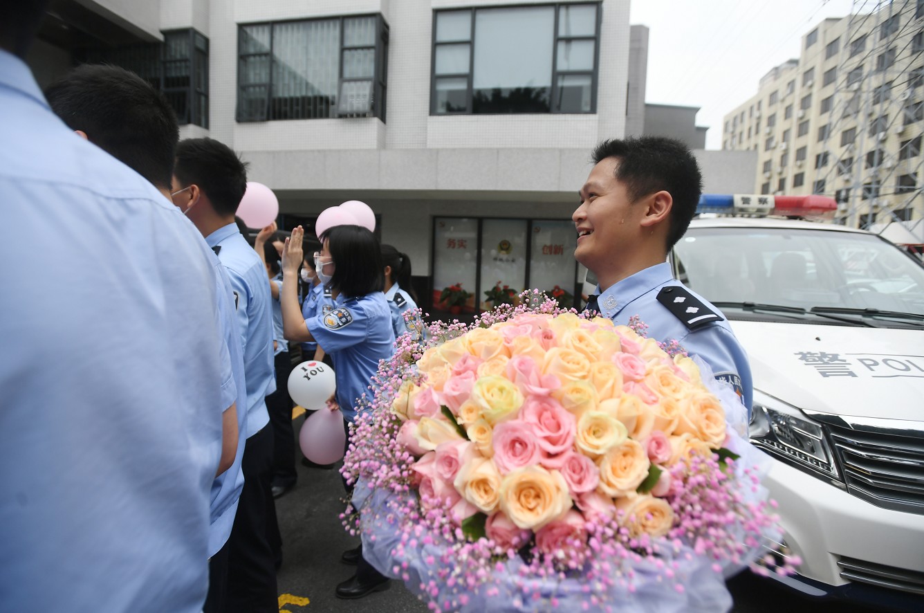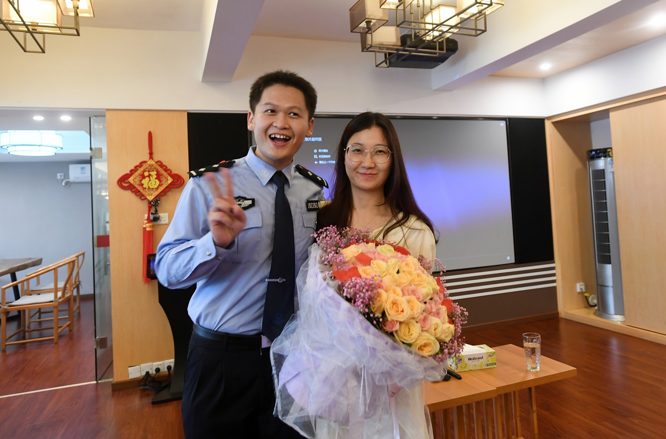 大概10多天前,倩婷又开玩笑地问他,520当天嘉辉会送什么礼物。“我当时心里就在想,要不把我自己‘送’给她吧。”从此,嘉辉就开始谋划着自己的浪漫求婚计划。在求婚地点的选择上,在征得领导同意后,他决定放在了分局里。“我们相识在警营,因警队结缘,我觉得这个地方最适合了。”