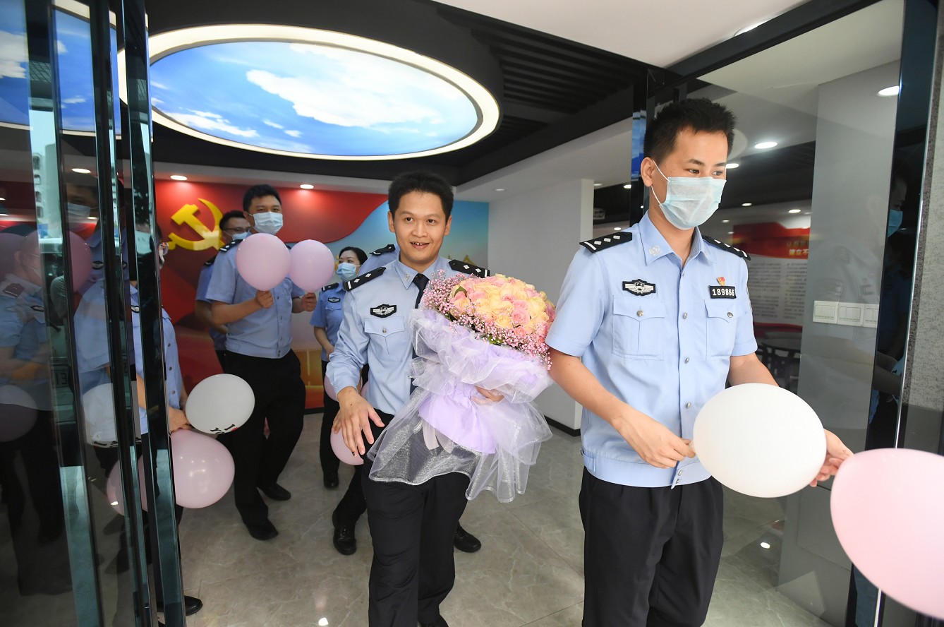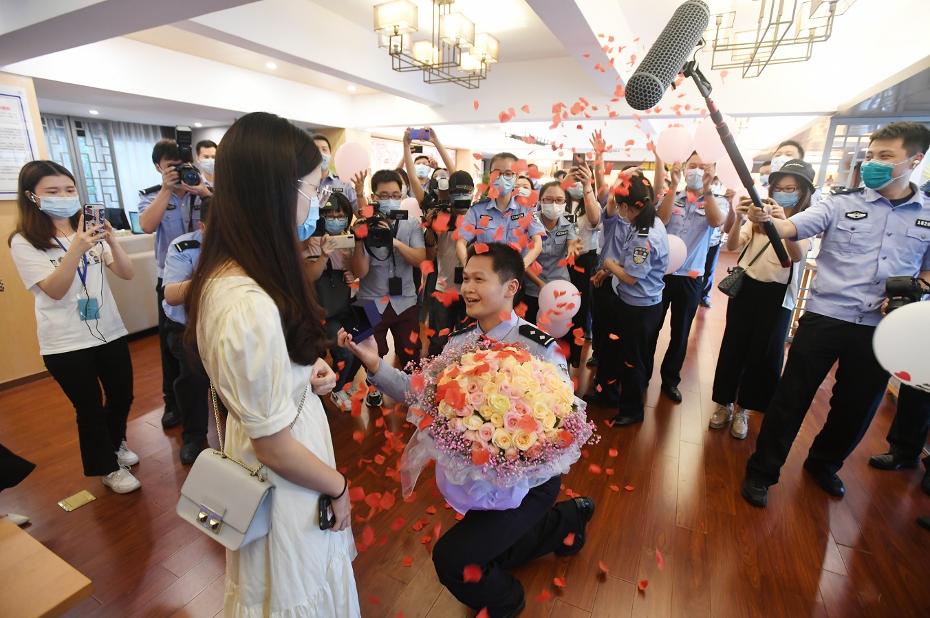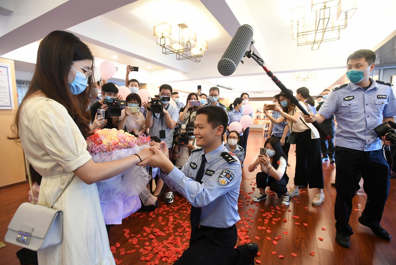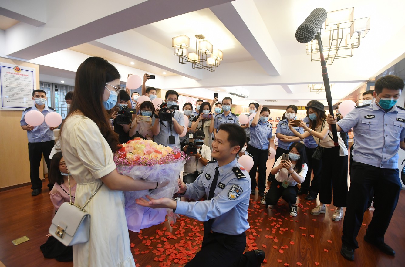 5月20日,在这个谐音“我爱你”的日子里,民警黄嘉辉和他的同事在禅城公安分局内为黄嘉辉的女友准备了“小惊喜”。在浪漫的铺垫过后,黄嘉辉手捧鲜花单膝跪地,向女友求婚。