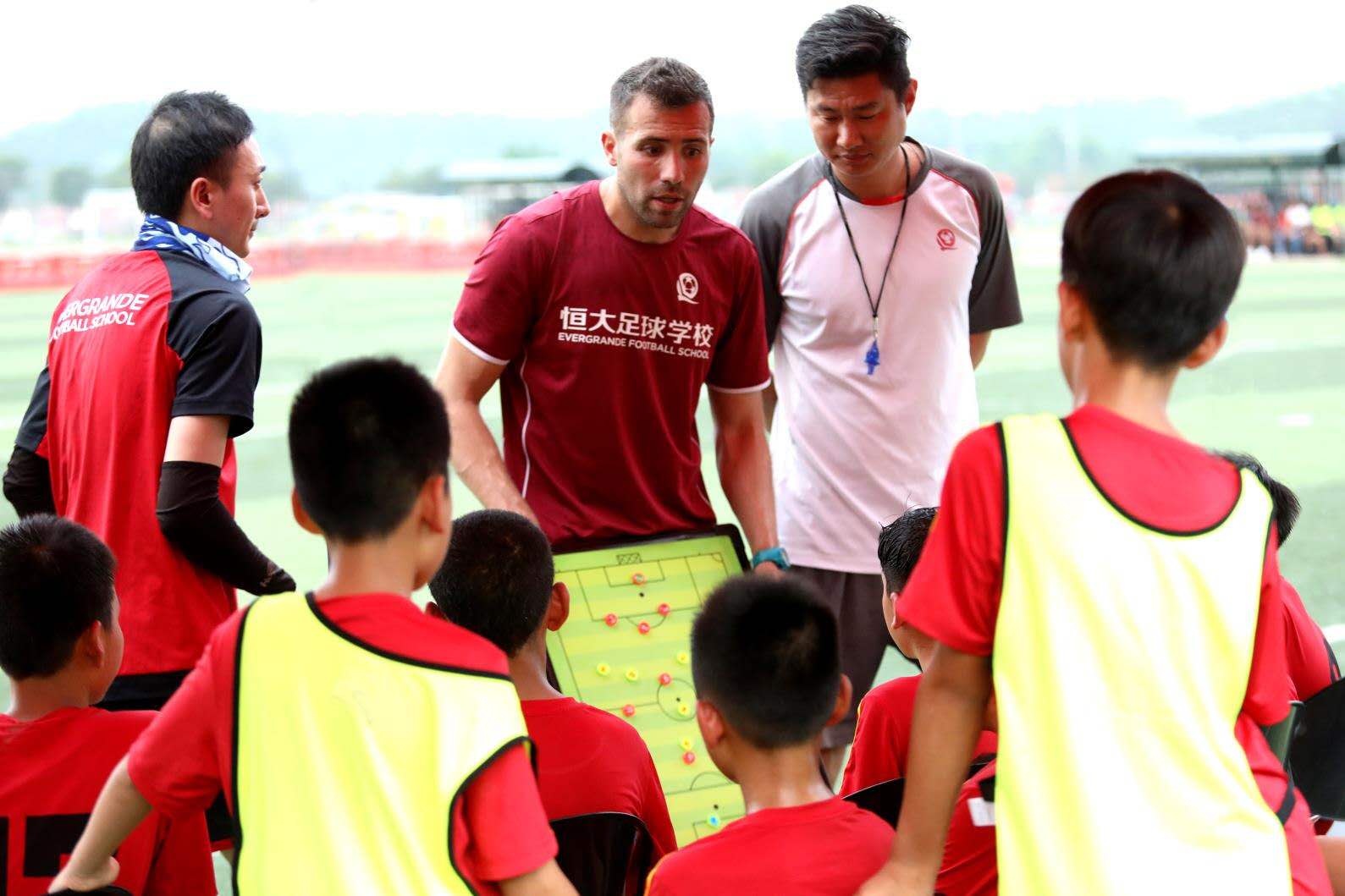 2019年4月25日,“足校联盟杯”恒大恒大足球学校外教现场战术布置。