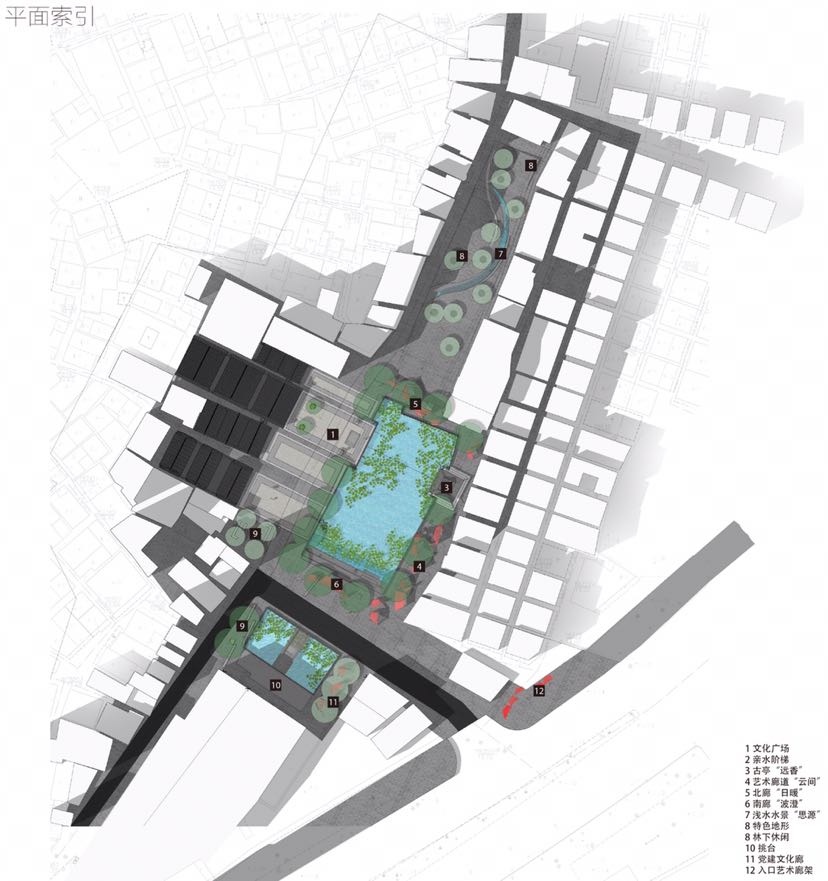 经讨论交流,最终大家一致认同“云山在望”的设计方案,认为其艺术性较高,可充分利用当地历史文化资源,建立“祠堂+前广场+风水塘”的联系,在风水塘边增加观景亭,形成东西、南北两条景观轴线,构建祠堂文化广场、艺术廊架休闲区、村委滨水广场、休闲活动公园四个功能分区。