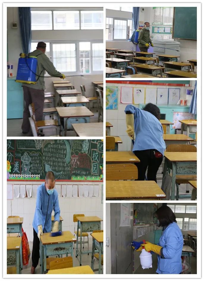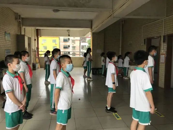 放学时间到了,同学们按左右前后间隔一米距离排成两列纵队,在老师的带领下有序离校。当全体师生离校后,学校各处进行彻底的清洁消毒。