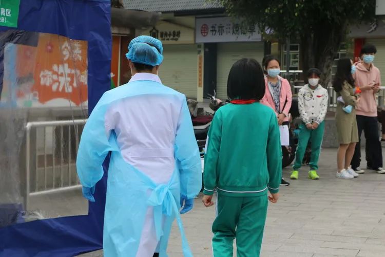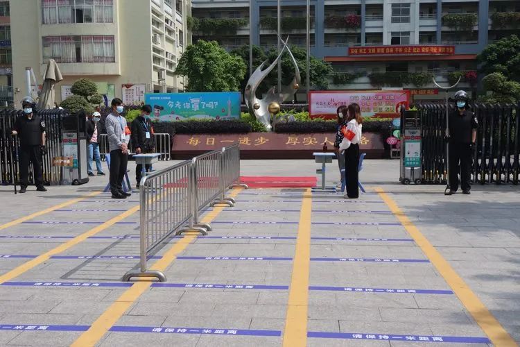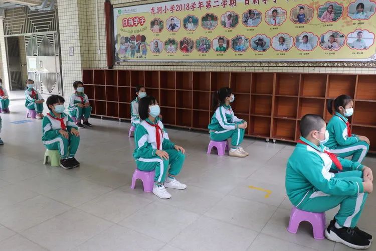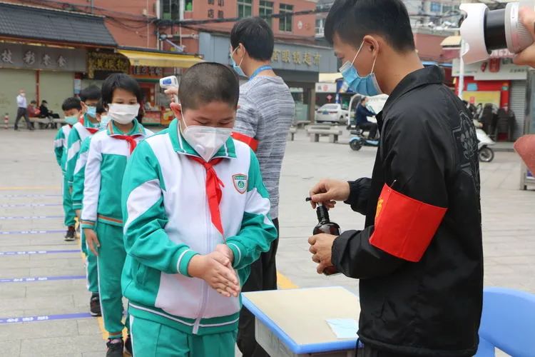 当天,阔别校园已久的龙洞小学学生早早就来到学校,迎接校园生活。为了避免学生在校门口聚集扎堆,龙洞小学三个校区都安排了学生分学段,分批次到校。从进入校门前学生之间就要间隔1米距离,进入校园后同学们需进行手部消毒-鞋底消毒-红外线测温-班级测温-登记,最后才能进入班级。