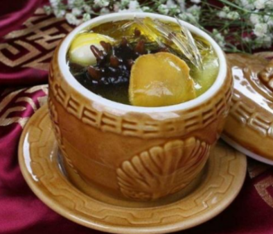 谭家黄焖佛跳墙:在煨制过程中几乎没有香味冒出,反而在煨成开坛之时,只需略略掀开荷叶,便有酒香扑鼻,直入心脾。盛出来汤浓色褐,却厚而不腻。食时酒香与各种香气混合,香飘四座,烂而不腐,口味无穷。