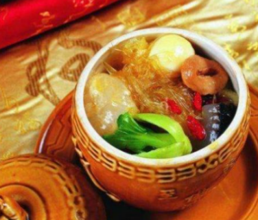 皇室佛跳墙:聚集高品质的海味食材,一菜多吃;味型浓郁、齿下留香,回味无穷;烹制方式:将所有的海味干货浸发待用,将发好的海味用肉汁煨入味,将器皿加热,然后放入煨好的海味装进去上台。