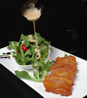 冰草香酥肉:荤素搭配,让人既吃到五花肉酥脆,又能品尝到冰菜清爽;特别配置“烘焙沙拉酱”用来沾着吃“绝”;烹制方式:将上乘的五花腩用特制香酥粉腌制,把油温控制在120°,放入油锅炸脆即可。