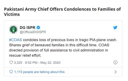 巴基斯坦武装部队发言人官方推特发文称:“巴基斯坦陆军参谋长向在巴基斯坦国际航空公司飞机坠毁中失去的宝贵生命表示哀悼。在这艰难的时刻,与失去亲人的家庭同悲。巴基斯坦陆军参谋长指示,向民政部门提供全面援助,协助救援工作。”