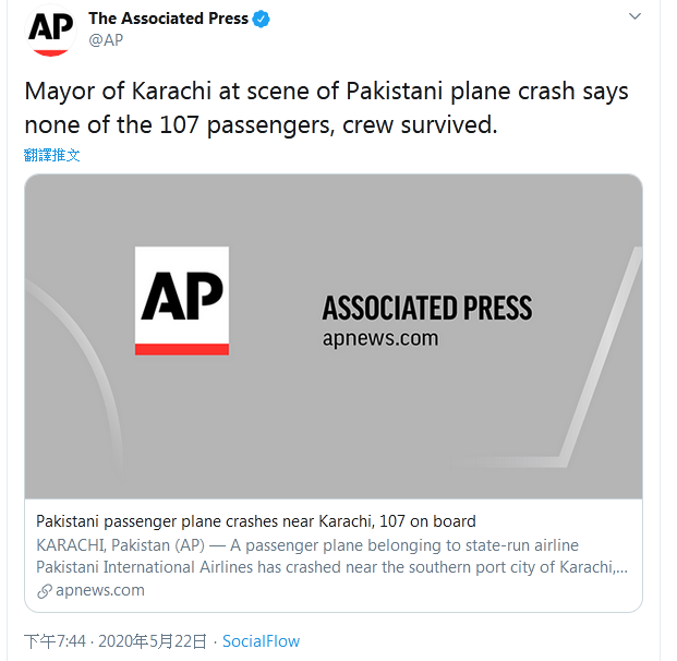 美联社刚刚消息称,巴基斯坦卡拉奇市市长表示,坠毁客机上107名乘客与机组人员无一生还。