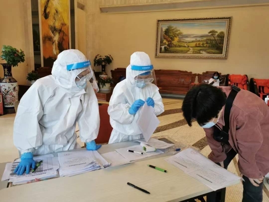 每天早晚两次的体温监测,更是考验了医务人员的体力和耐力。因防止感染的关系,医务人员工作中不能使用电梯,他们穿着密不透风的防护服爬6层楼穿梭在170多间房,逐一敲开客人的房间,请每一位客人在走廊测量体温,每次都至少花2小时才能完成所有客人的体温监测工作。