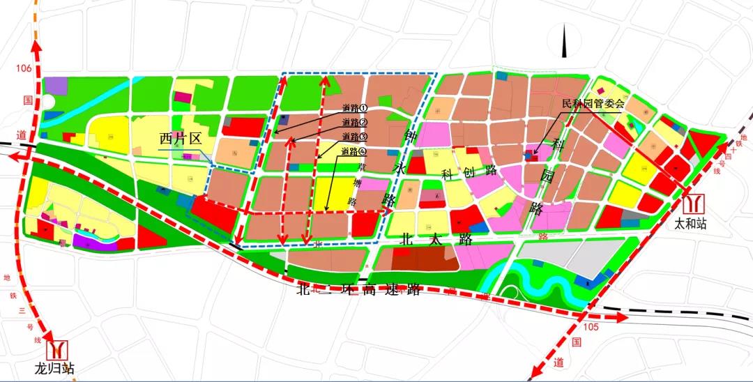 西片区4条道路东至规划钟永路,南至北太路,西北至太和镇北村村、柏塘村,总长度4公里,编号1、2、3道路南北走向,编号4道路为东西走向。