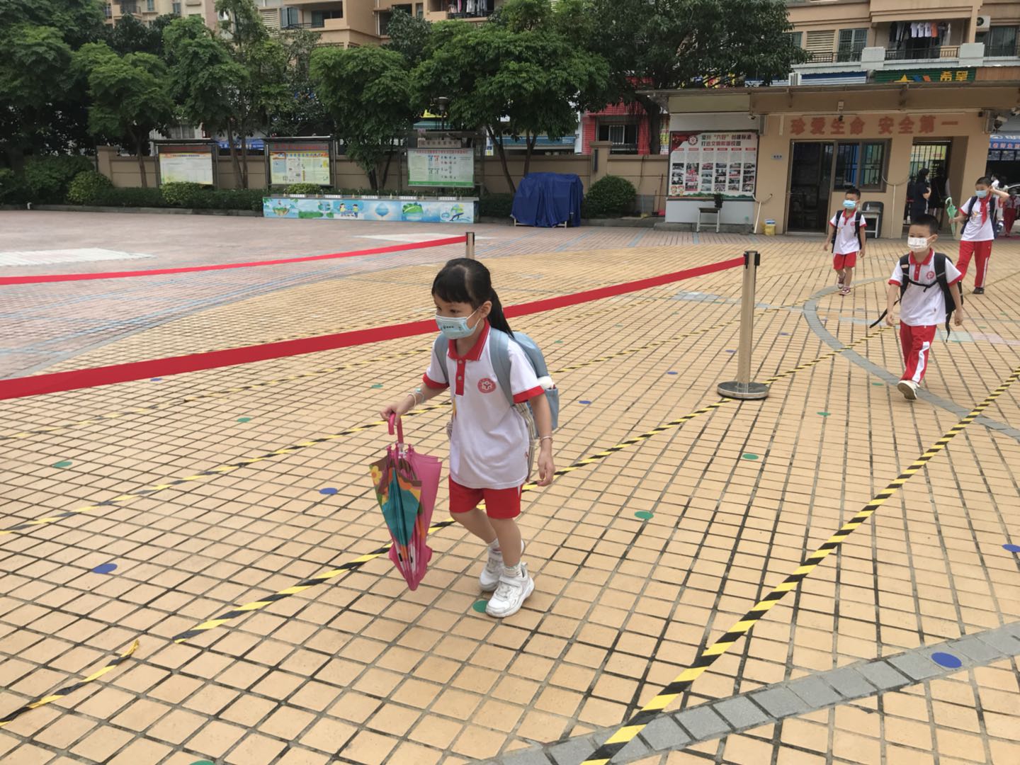 在从化雅居乐小学,学校安排了学生错峰出行,三年级学生安排在7:40-7:55返校,一、二年级安排在7:55-8:10返校。老师也站在学校门口,指引学生隔开距离,不结对,测温之后有序进入校园。