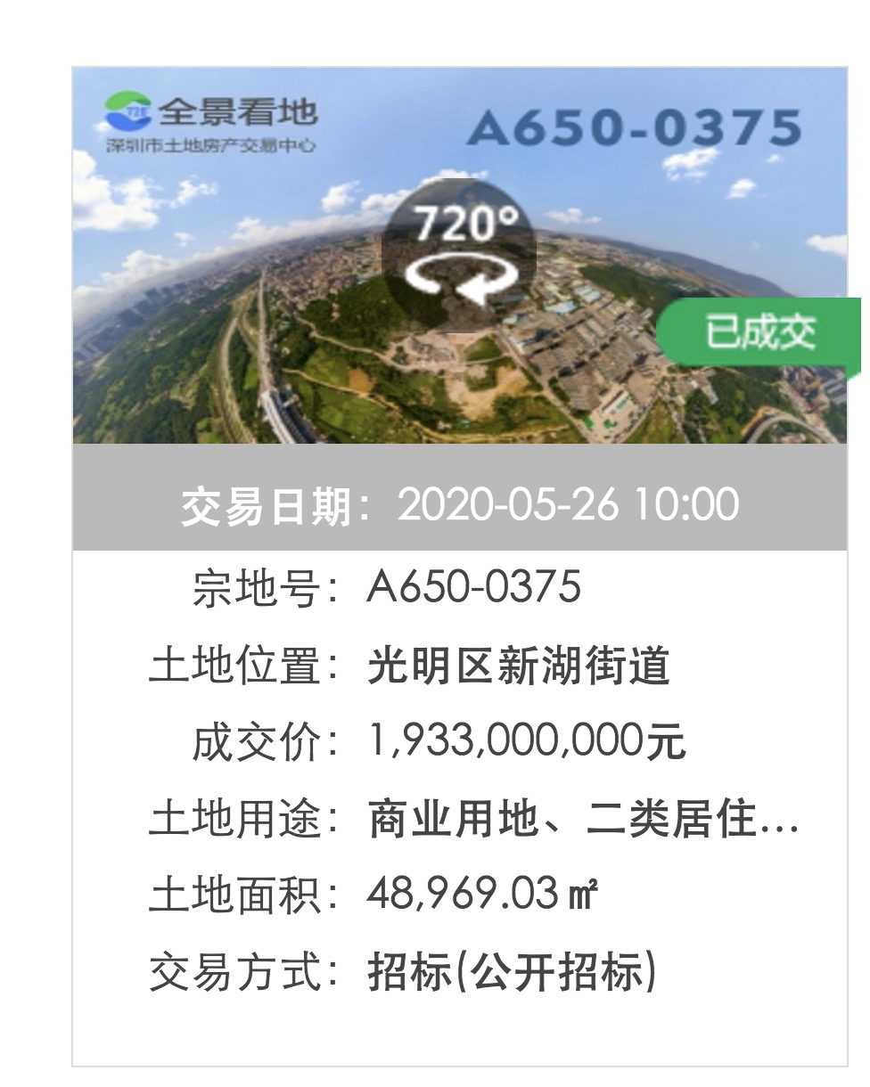 位于地铁6号线科学公园站旁,配建超过220米高地标建筑的光明区新湖街道A650-0375宗地,5月26日以招标方式公开出让。深圳市光明集团有限公司以商务标报价19.33亿元成交,综合楼面单价7406.84元/平方米。