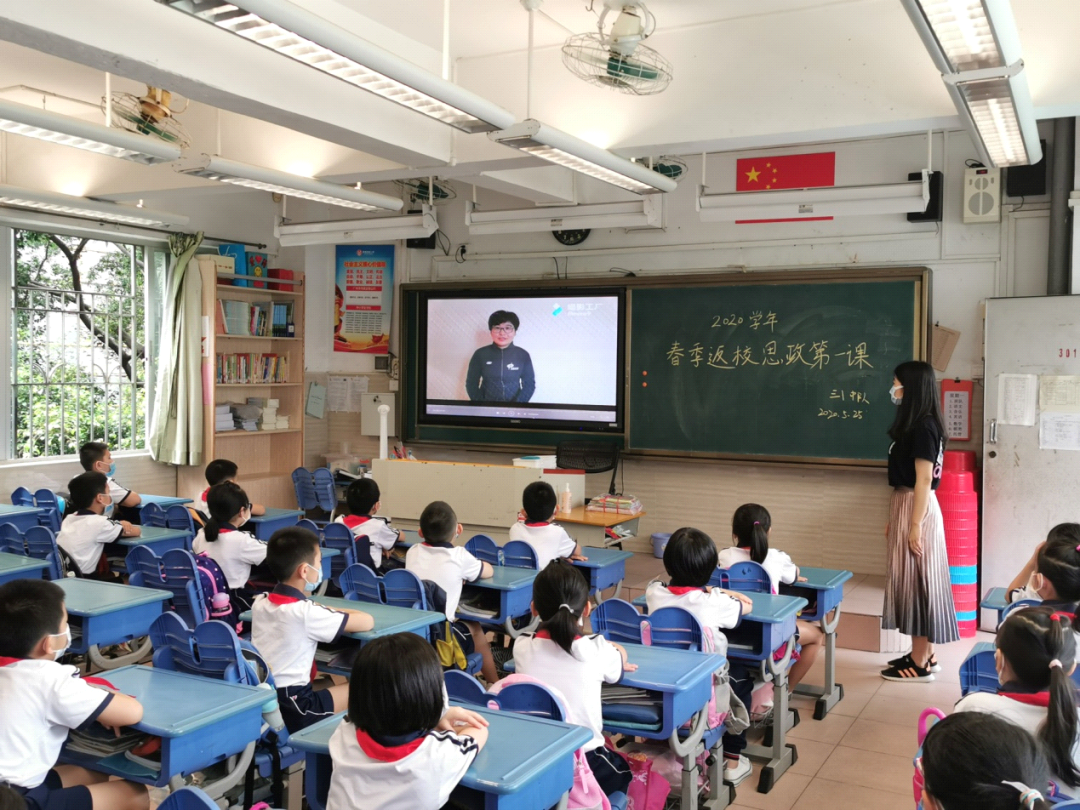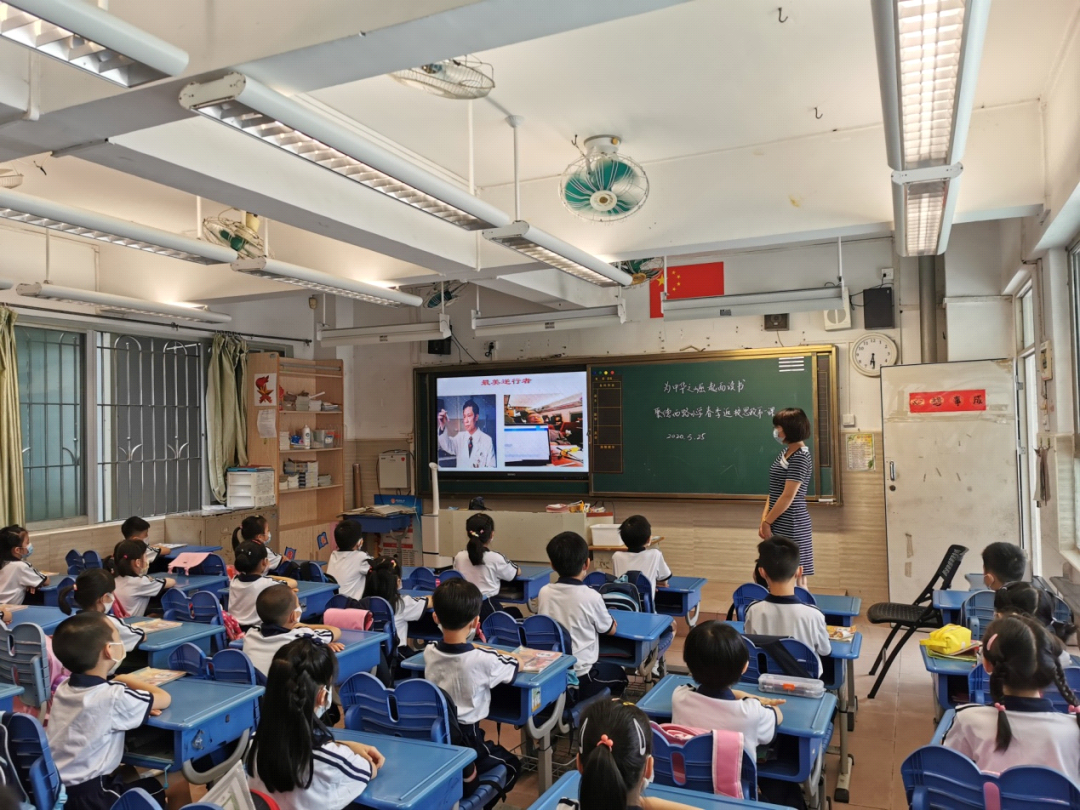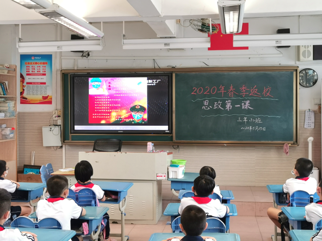 同学们有序回到课室后,由聚徳西路小学校长、党支部书记何卫常结合学校疫情期间的思政特色对师生开讲春季返校战“疫”思政第一课,引导师生厚植爱国情怀,同学和老师们认真聆听,坚定了战胜疫情的信心与决心。