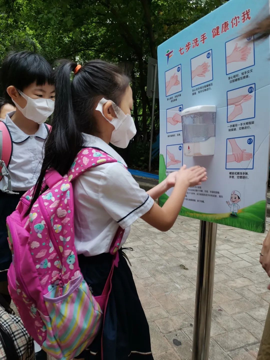 防疫期间,天府路小学东方校区南门和北门均开放给学生入校。从早上7:40开始,五年级的同学就陆续进入校门。根据入校时间安排,一年级同学早上8:30从南门入校。进校通道沿途设置了免洗洗手液。校门入口设置了鞋底消毒垫和红外线测温设备。同学们拎着个人物品有序地沿着指定通道进入校园。一年级的小豆丁重返校园,家长们都护送到进校通道旁才离去。有家长为了纪念孩子返校,在分别前为孩子拍照留念。