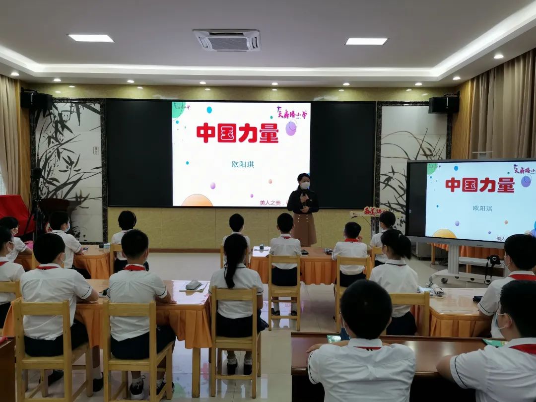 随着低年级同学返校,天府路小学全体班级集结完毕。今天上午在阶梯教室,天府路小学校长欧阳琪以《中国力量》为题为五年级7班的孩子们上了复学后的第一节思政课。同时,东方校区、翠湖校区、113中学教学点的其他71个班级的同学通过视频同时在线收看。