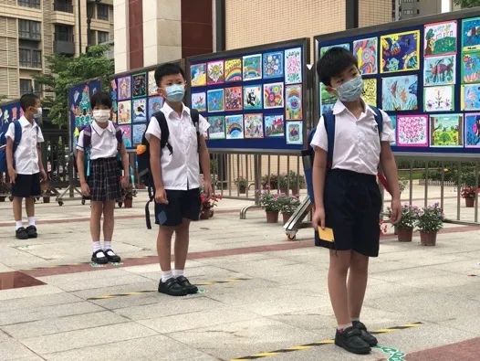 “踩在小脚印上,保持一米距离。”在广钢荔湾学校小学部的入校通道上,学校贴心的准备了小脚印的标志,通过老师的指引提醒,让同学们保持好安全距离。走过入校通道,小豆丁们正式开始“挑战”进课室“过三关”:认字、测温、洗手!
