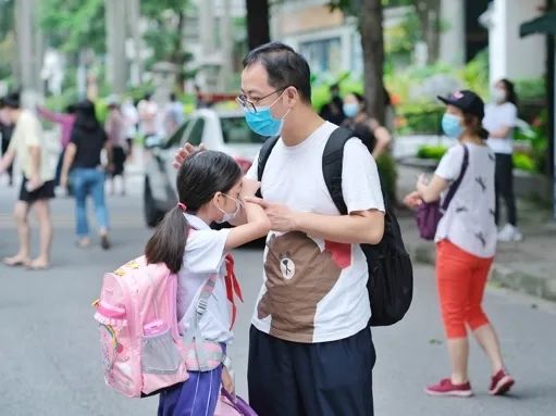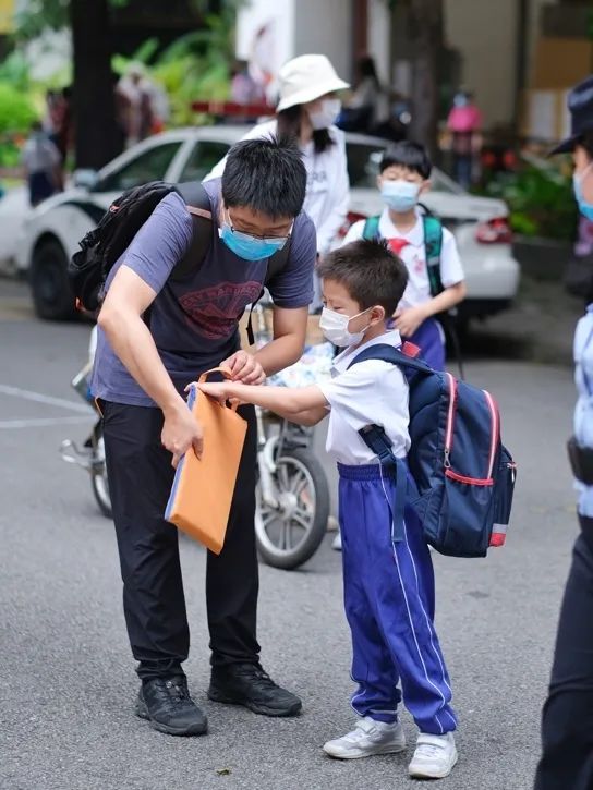早在七点三十分,沙面实验学校的老师们、岭南街的工作人员早早站在校园门,迎接“小豆丁”的返校。小荔现场所见,校门增加了水马和栏杆。家长送孩子上学,只能护送到水马前,有效减少扎堆送学现象。