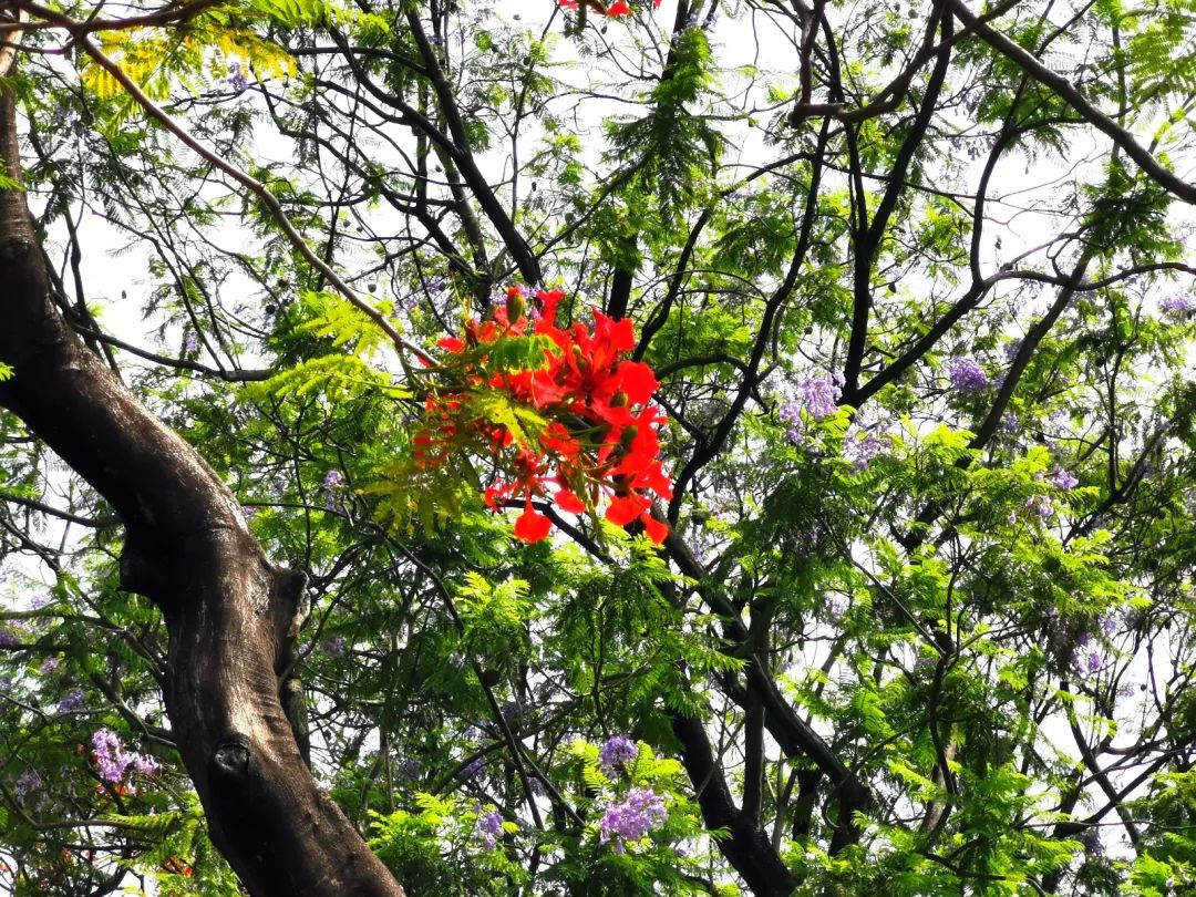 事实上,凤凰木又被称作红花楹,与蓝花楹长得极为相似。因此,世人也常把这两种树,并称为"双影"。"红影树"是凤凰木,"蓝影树"是蓝花楹。前者红红一片,璀璨艳丽,豪放而更具火热;后者蓝紫相间,宁静脱俗,矜持而不失灿烂。