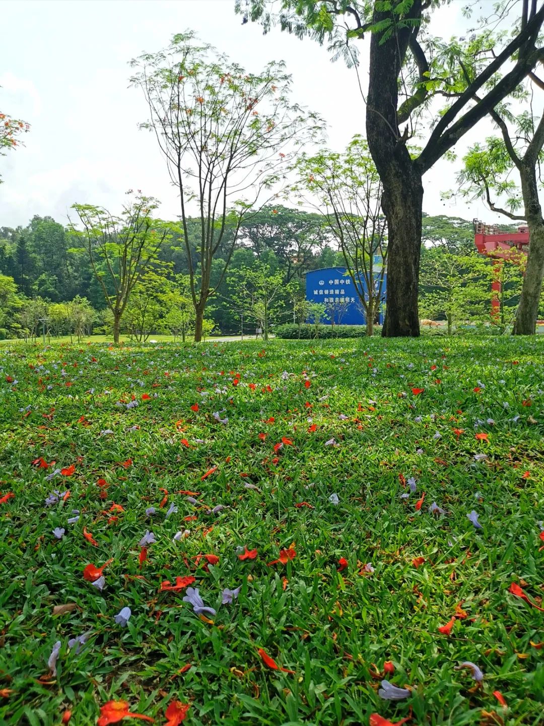 当如水蓝花楹遇上似火凤凰花,两树繁花交相辉映,像极了依偎在一起的情侣,美丽又浪漫。两树之间的草坪,也点缀着蓝色、红色的花瓣,落英缤纷。