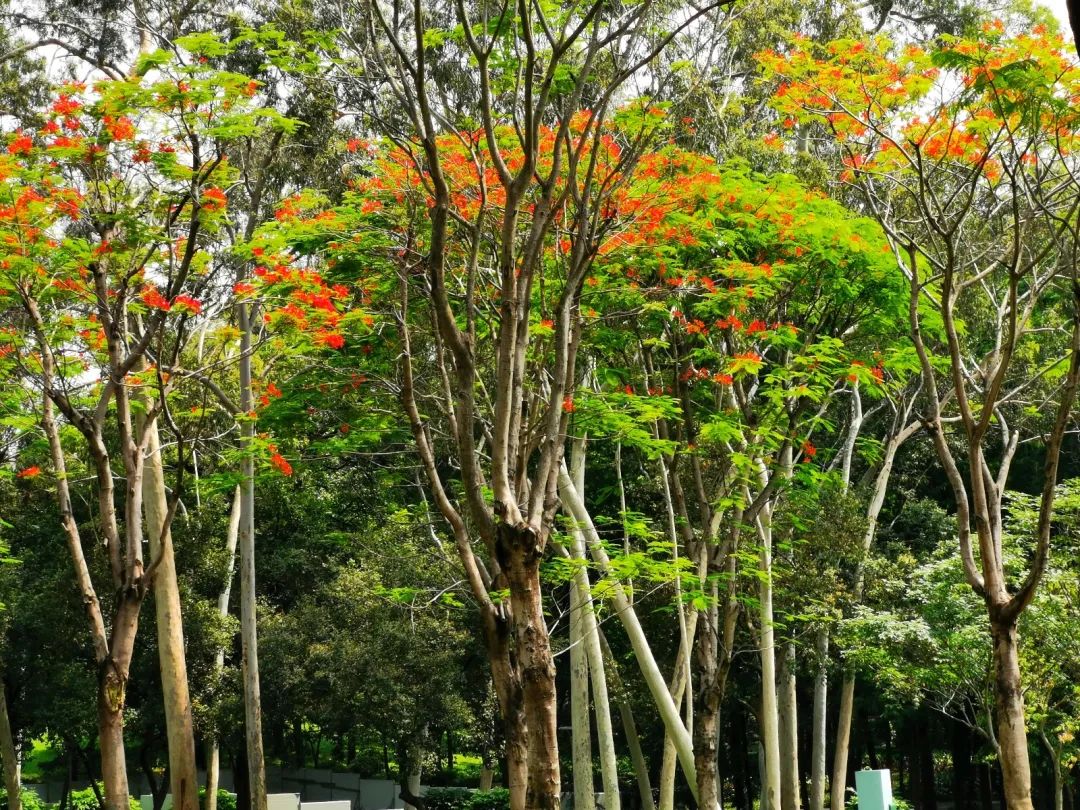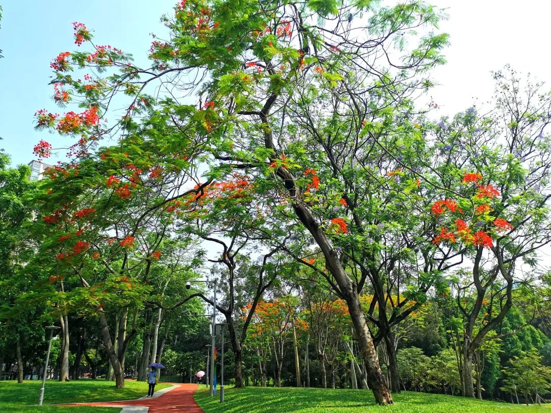 小e了解到,除了天河公园,在广州的海印桥脚、白云大道、东山湖公园(越秀区东湖路)、烈士陵园(越秀区中山三路)、越秀公园(越秀区解放北路)、黄花岗公园(越秀区先烈中路)、流花湖公园(荔湾区东风西路)、荔湾湖公园(荔湾区泮塘路)、珠江公园(天河区花城大道)、纯阳观(海珠区瑞康路)、动物园(越秀区先烈中路)、华南植物园(天河区天源路)、海珠广场(越秀区沿江中路)等地,也可欣赏到凤凰木叶绿花红、满树如火的美景。