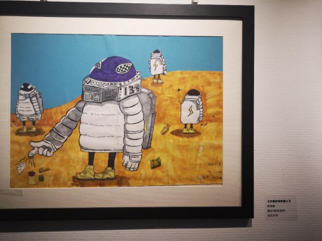 孩子们脑洞大开,许多作品聚焦未来世界,童趣十足的画笔描绘了沙滩清洁机器人、仿生机器人、人工智能、基因树、飞行书包、虫洞旅游等。