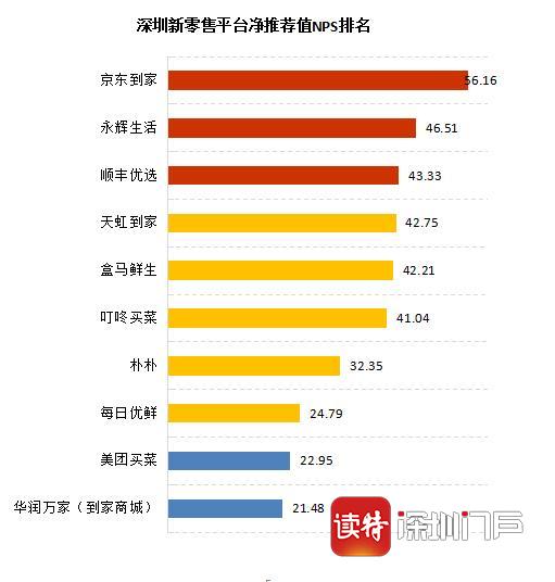 (一)消费者整体推荐意愿较高,NPS净推荐值前三名依次为京东到家、永辉生活和顺丰优选。10家新零售平台整体的平均净推荐值为37.96,且10家新零售平台的净推荐值均为正值,排名前三的依次为京东到家、永辉生活和顺丰优选。