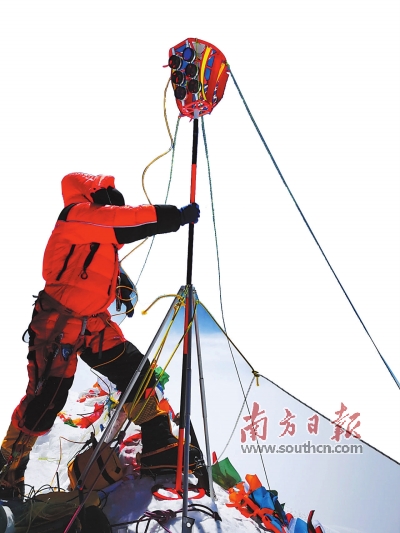 高高矗立在珠峰峰顶的觇标是另一个主力测绘设备。它非常醒目,颜色鲜艳,由广州企业定制研发。 受访者供图