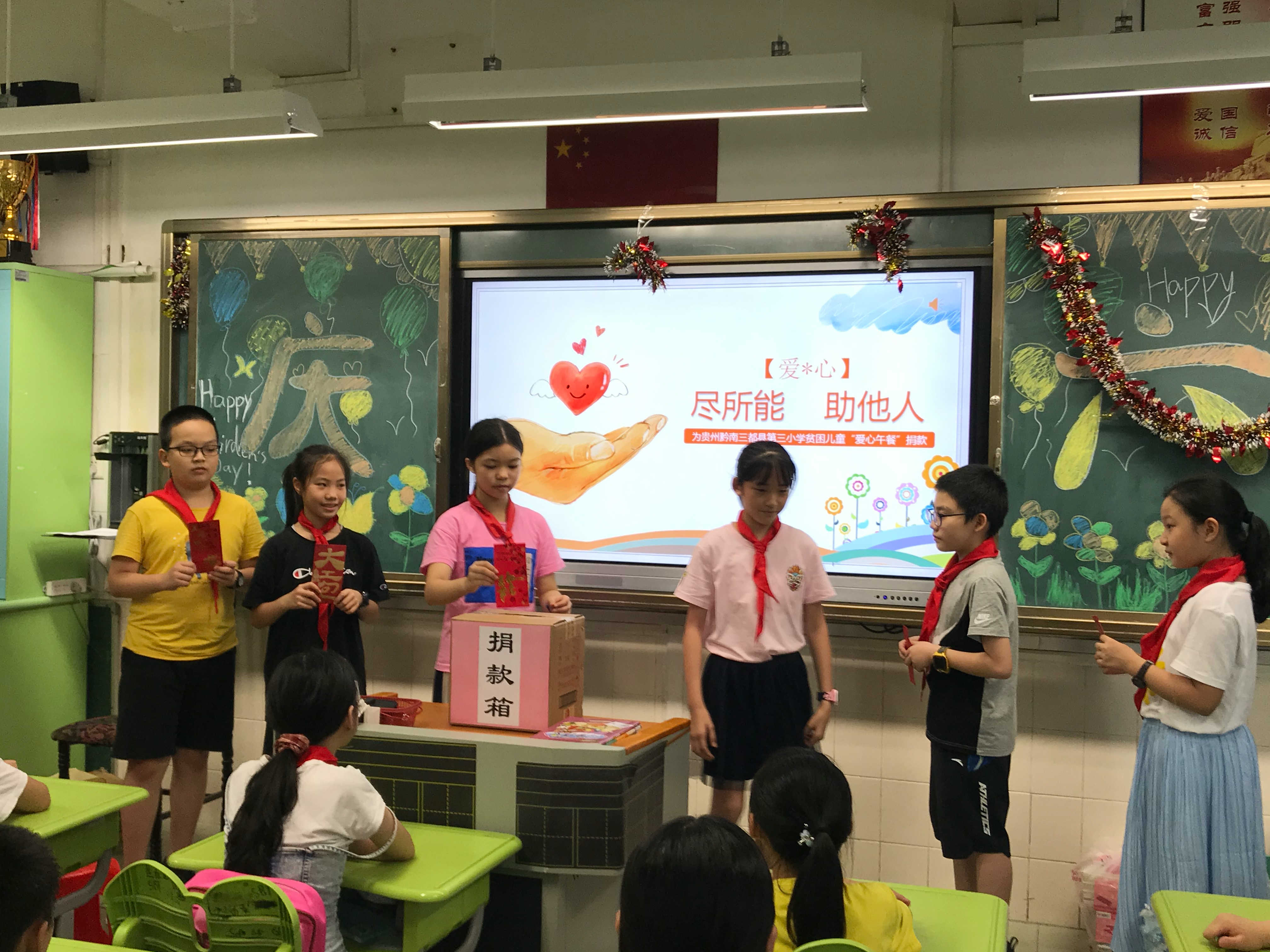 今日,广州市黄埔区荔园小学举办“记‘疫’中成长,友爱庆‘六一’”活动。为了让学生们度过一个平凡但意义非凡的“六一”儿童节,该校为牵手学校贵州省黔南三都县第三小学开展“爱心午餐”捐款活动。