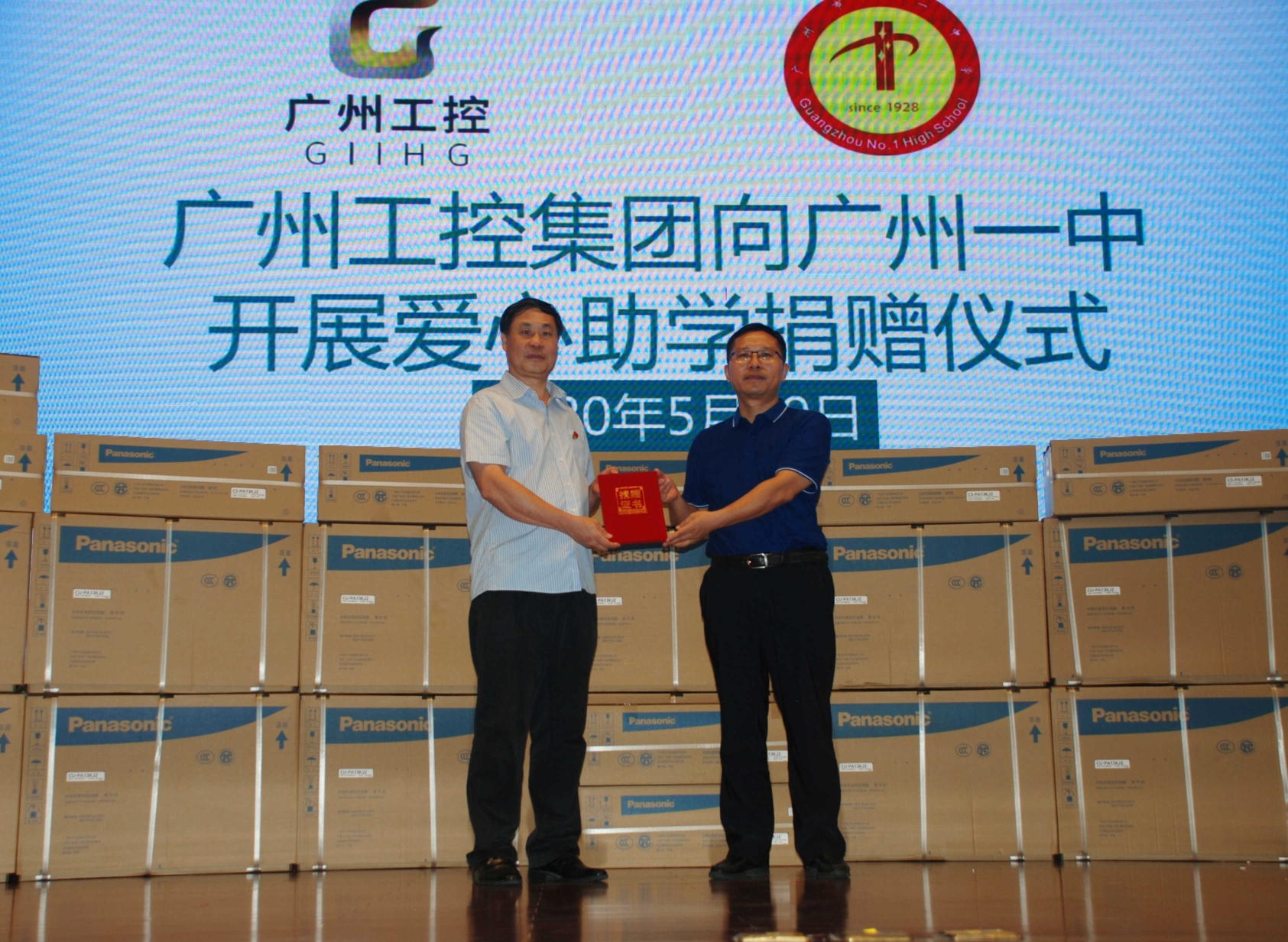 捐赠仪式在广州一中至毅堂的举行。在荔湾区领导、教育局领导、广州工控领导的共同见证下,广州工控集团代表向广州市荔湾慈善会代表以及广州一中代表捐赠空调物资。广州一中回赠“勇担社会责任、助力一中腾飞”锦旗。