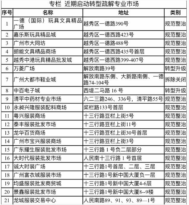 《规划》表示,将积极引导该区域专业批发市场向展贸中心、交易中心转变,引导市场商铺进行公司化改造。参照火车站流花地区做法,持续开展人民南路、十三行、清平中药材市场等片区专业批发市场综合整治。
