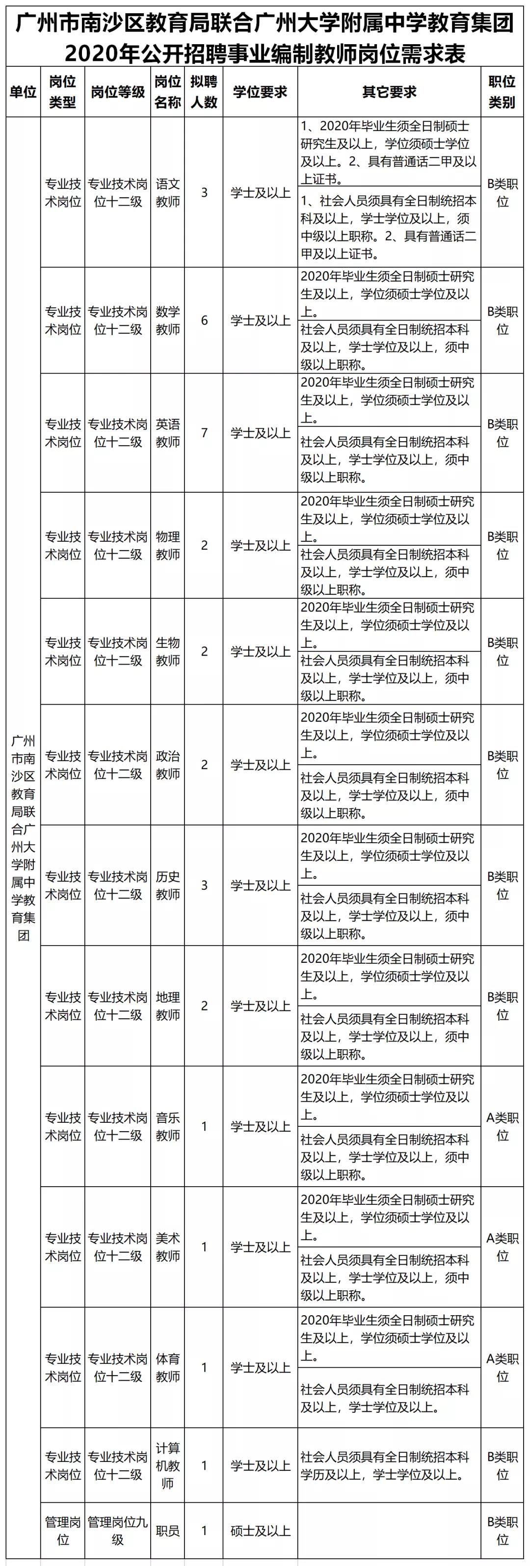 广大附中(南沙)实验学校招聘人员范围为全日制普通高等院校2020年应届毕业生(含符合择业期政策的毕业生)及符合条件的社会人员。“应届毕业生”是指2020年1月1日至2020年12月31日之间取得全日制普通高等院校硕士研究生及以上学历、学位需硕士学位及以上的毕业生【含国(境)外符合条件的毕业生】及符合《关于实行广东省普通高等学校毕业生就业择业期政策(试行)的通知》规定的择业期毕业生。“社会人员”是指除应届毕业生以外的符合招聘公告中规定条件的其他人员【含国(境)外符合条件人员】。招聘岗位和资格条件如下: