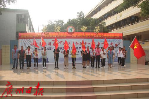 龙潭中学大队部看展七年级建队仪式,校领导为各中队授旗