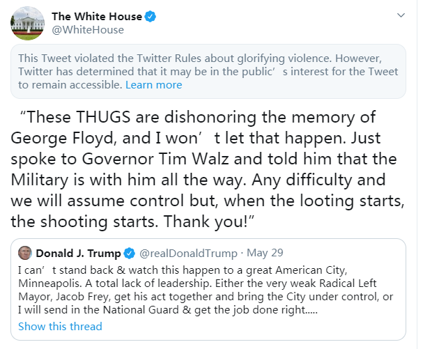 据美国《国会山报》报道,特朗普29日在推特上评论明尼阿波利斯市的抗议事件,并称“当抢劫开始时,射击就开始了”。这一言论被推特认定为“美化暴力”,目前推文已被隐藏。推特29日表示,特朗普的这条推文以“威胁开枪”回应骚乱事件,这违反了推特公司的规定。不过,用户通过单击“浏览”仍然可以查看白宫转推特朗普的推文,但无法点击“喜欢”、评论或是转推。