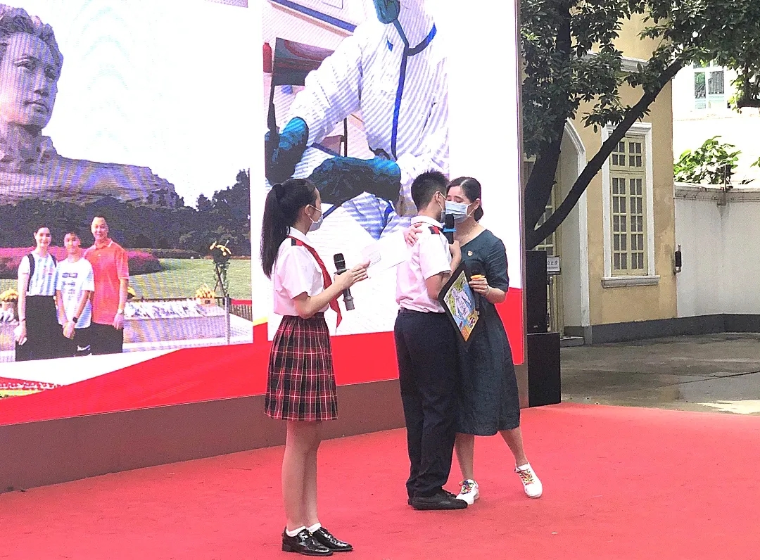 在活动现场,区少理事、农林下路小学少先队员林致言为大家分享了一个真实故事,来自于的越秀区建设六马路小学队员蔡文俊的文章《我的妈妈上战场》。文俊妈妈是广州市第八人民医院感染病中心ICU护士长钟燕萍,疫情期间一直奋战在守护广州的最前线。通过致言的分享,我们感受到了文俊的心路历程和成长经验,表达了医护子女对父母的理解和尊敬,这正是千万个抗疫一线医护家庭“舍小家、为大家”的真实缩影。文俊在活动现场为妈妈献上了自己亲手画的画,还给妈妈送上了一个大大的拥抱,这一幕令人为之动容。