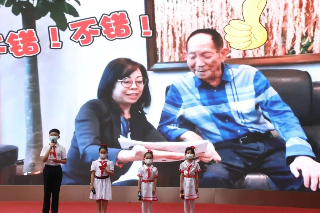 在压轴环节,还播放了一段讲述袁隆平与越秀队员特殊情谊的视频。在此前越秀区“寻访先锋”系列活动中,越秀区桂花岗小学的队员们,通力合作为他们心目中的偶像——袁隆平精心制作了一本手绘本,并成功送到了袁隆平的手中。袁隆平一边看一边说“不错不错”,并为越秀队员的奇思妙想和赤子之心点赞!来自偶像的肯定便是这个六一节最好的礼物,这让队员们更加坚定了要向袁隆平为代表的广大科技工作者好好学习的决心,并用一首全场大合唱《听我说谢谢你》再次向先锋致敬。