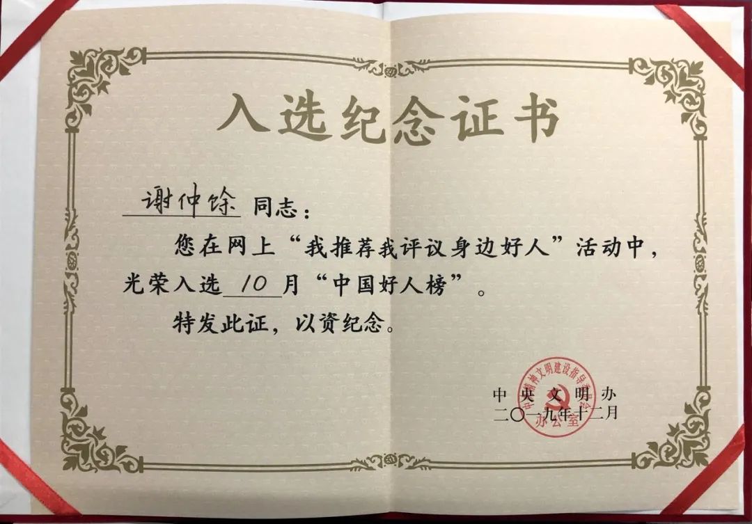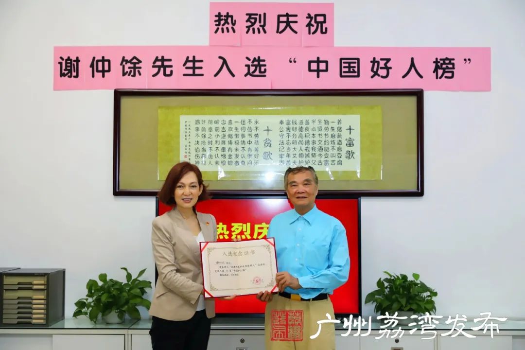 据了解,2019年,荔湾区涌现出一大批践行社会主义核心价值观的杰出代表。其中,荔湾区代表许晓东先生、谢仲馀先生等两位被评为中国好人,谢小夏女士被为广东好人,蔡有信先生、郭鸟叶女士、冯雪莹女士、叶志坚先生、付雪勤女士、黄龙添先生等六位被评为广州好人。颁奖现场,上榜人谢仲馀、许晓东在领取证书时表示,很感激荔湾区给予自己这个机会,这份证书既是荣誉更是责任,今后,自己也将继续发挥引领作用,做好道德表率。