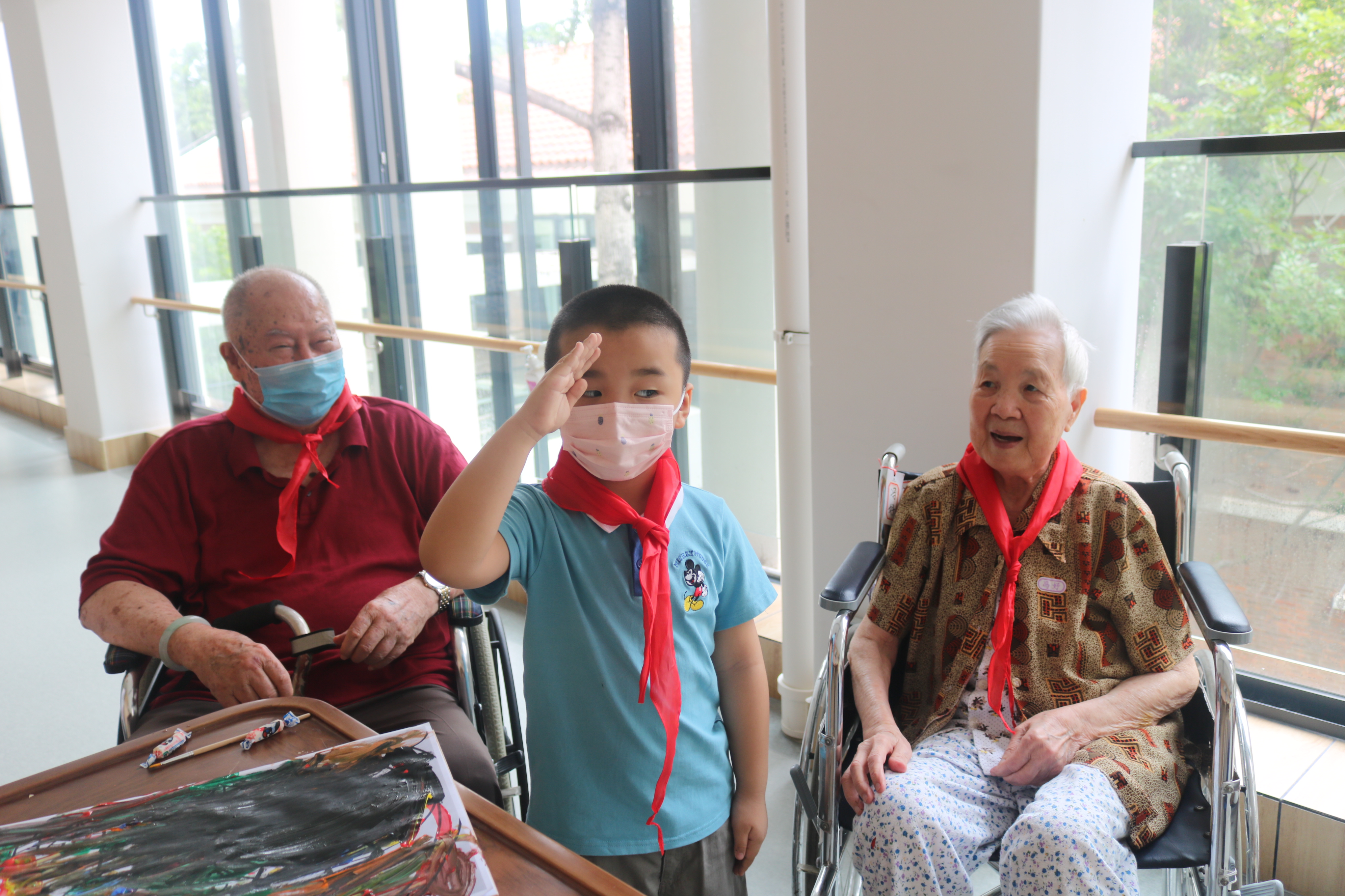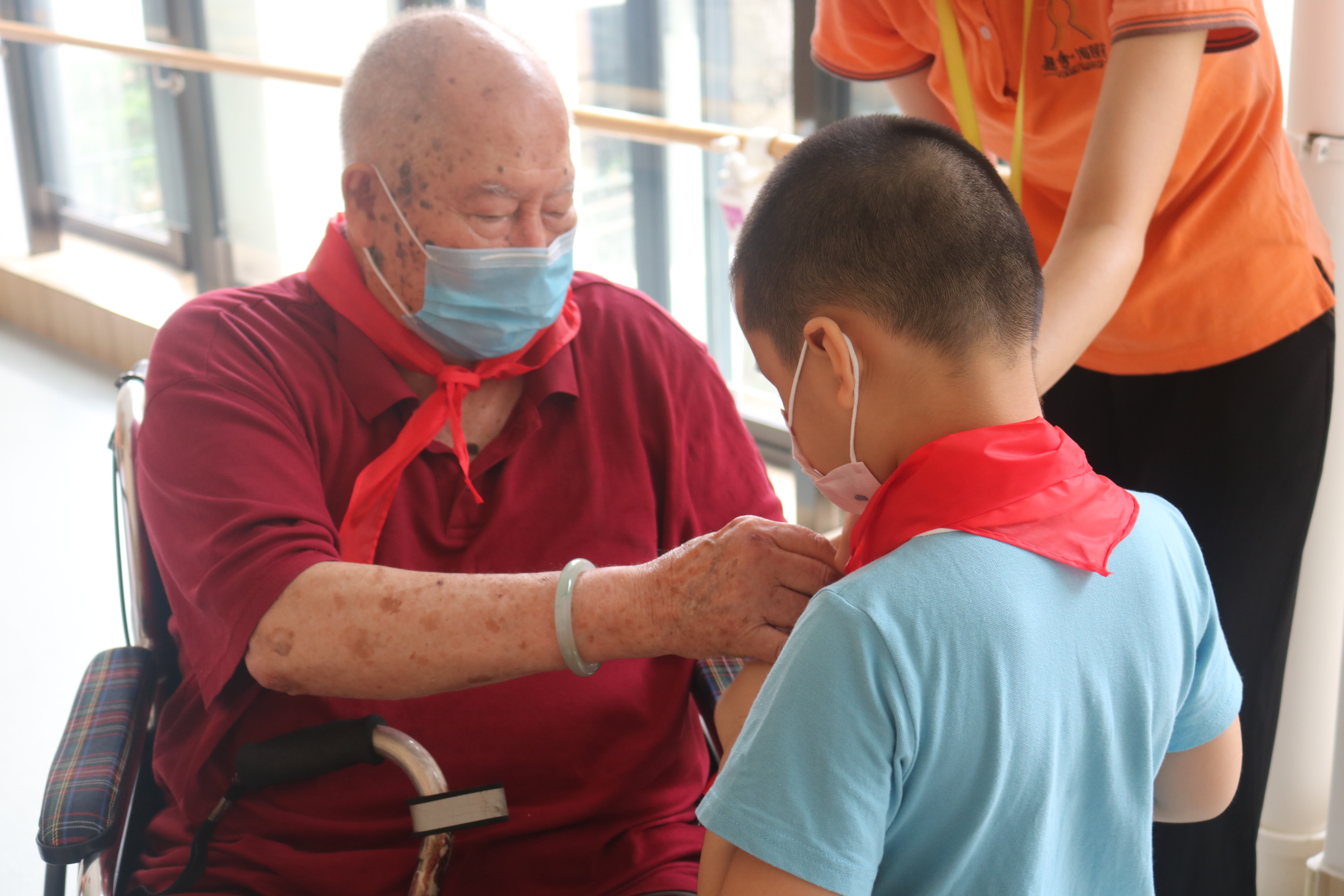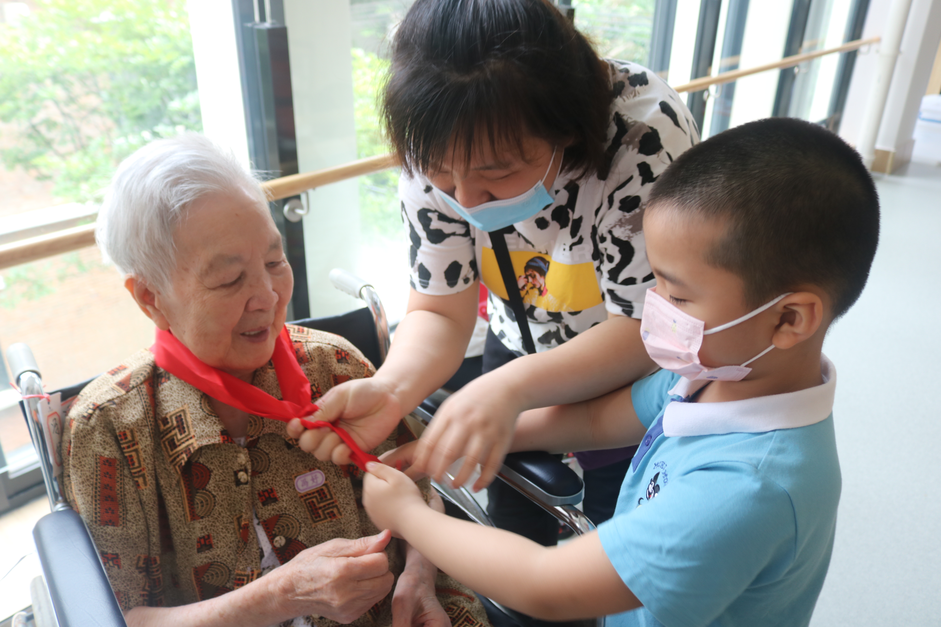 今天,工作人员们脑洞大开,让五位“共产主义接班人”为长者们重新戴上红领巾,仪式感满满的,在红领巾的衬托下,长者们的笑容更是美得像花儿一样红。