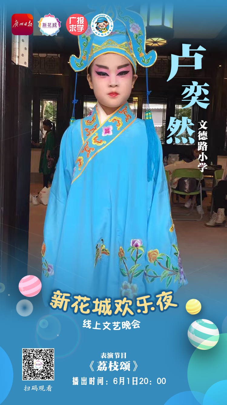 卢奕然是广州文德路小学六年级一班的学生。六岁起师从麦嘉、胡涓涓两位粤剧名伶,至今已学艺六年。曾在国内外多地登台演出,并获得好成绩,曾代表越秀区到韩国进行艺术交流。她还是文德路小学合唱团成员之一,获得2019广州校园合唱大赛一等奖。