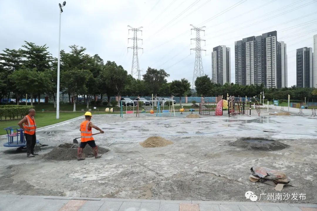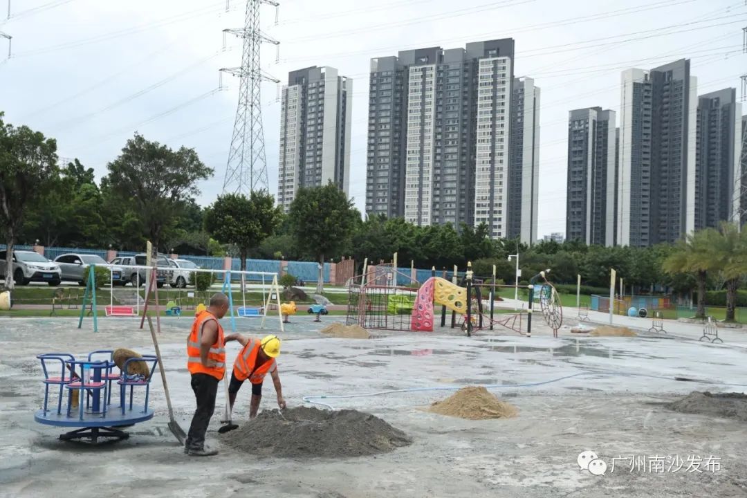 5月29日,在南沙区儿童公园的儿童器械区内,不少工人在更换维修儿童游乐设备。区儿童公园相关负责人告诉小南,公园内新增了1套自行车迷宫,同时还增加了摇摇马等儿童喜欢的器械。在公园内的沙滩区,工人们聚在一起为沙滩清洗沙子,并且更换过滤一旁水池的水,让儿童们在此游玩的时候接触到干净清洁的沙子和水。