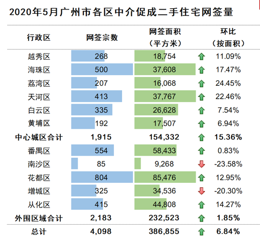 《报告》显示,全市中介促成的二手住宅市场成交继续保持增长态势。5月,广州全市(含增城、从化)二手住宅交易市场中介促成的新增放盘面积与网签面积分别为40.47万平方米和38.69万平方米。