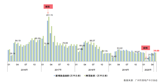 《报告》显示,5月广州全市(含增城、从化)二手住宅交易市场中介促成的新增放盘面积与网签面积分别为40.47万平方米和38.69万平方米,环比分别增长8.80%和6.84%,同比分别下降16.66%和19.84%。