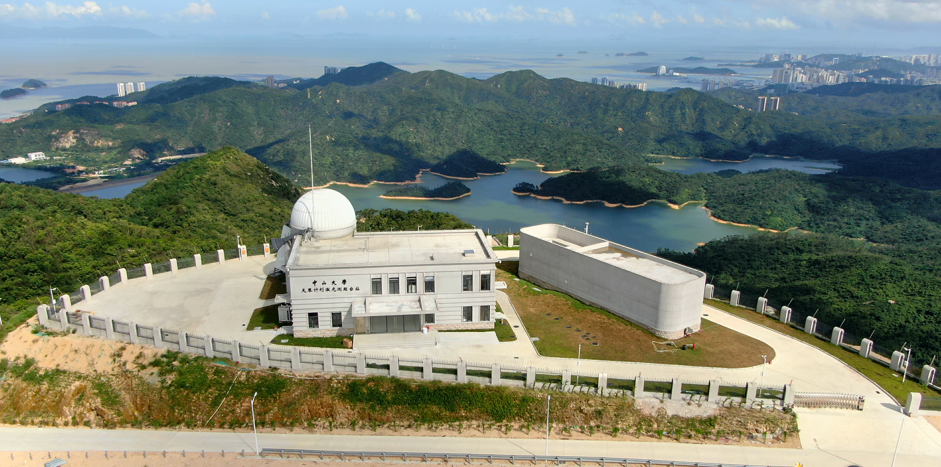 5月25日,中山大学珠海校区凤凰山在雨中若隐若现。沿着蜿蜒曲折的盘山公路一路乘车上行,记者来到了海拔近400米的山顶。山顶矗立着一座朴实的小型建筑,和一个外形酷似足球的白色球体。这里就是天琴计划激光测距台站的所在。