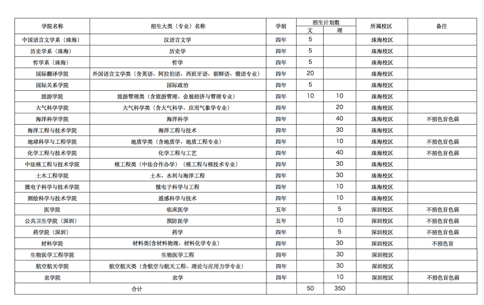 招生大类(专业)有22个,其中文科包括汉语言文学、历史学、哲学、外国语言文学类等,理科包括大气科学类、海洋科学、地质学类、临床医学等。招生计划数共有400名,其中文科50名,理科350名。招生简章明确,中山大学根据生源情况可进行文理科类计划的调整。