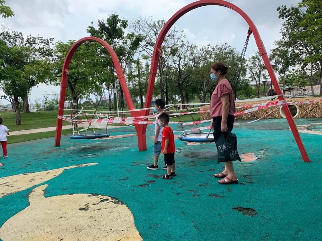 相关工作人员透漏,由于园区内部分游乐设施处于暂时关闭状态,出现小部分游客忽视警戒带和相关告示,将小孩抱进围蔽区域内玩耍。针对此类不文明现象,公园保安及管理人员会及时进行制止和劝阻,并向其解释说明疫情期间防控工作的必要性;此外,园区内保安队伍也加强巡逻,及时制止不文明现象发生。