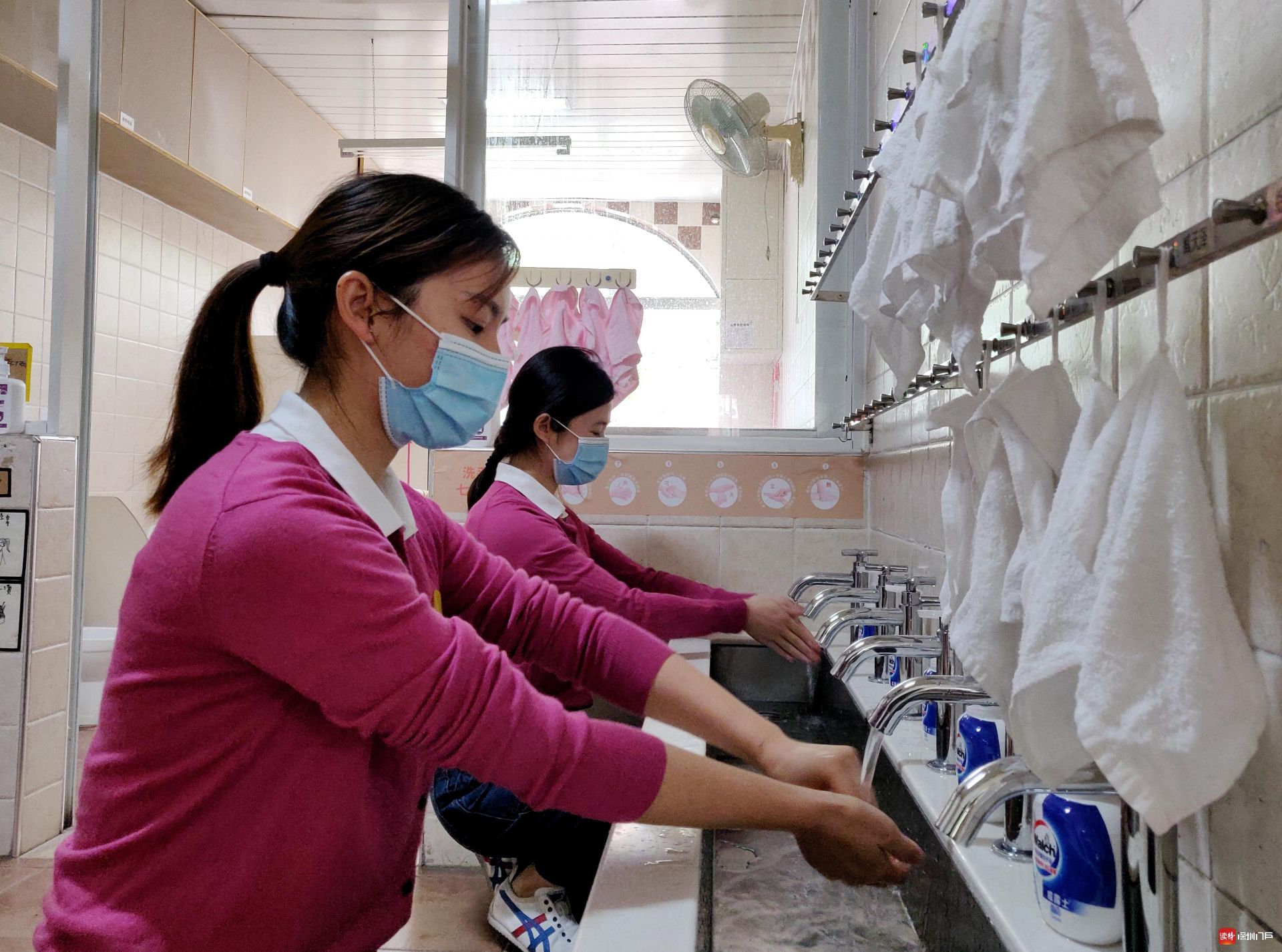华中科技大学公共卫生学院儿少卫生与妇幼保健专业毕业的谢姝老师在该园担任保健医生兼课程观察员,她介绍,为应对疫情防控,幼儿园执行十分严格的防控规定,如,每个班级设置区域活动时间段,分三次提供水果;午休时间床铺加宽摆放间距,头脚交叉入睡;就餐时,每张桌子不超过4人定位用餐;分批饮水,一次进入洗手间不超过 8 人;且厕所每次使用完后,专人负责为坐便圈、冲水按键部位消毒;每日全园教室、活动室、户外大型器械均有专人负责消毒、清洁;全体班主任、保育员都经过了严格的培训和考核。