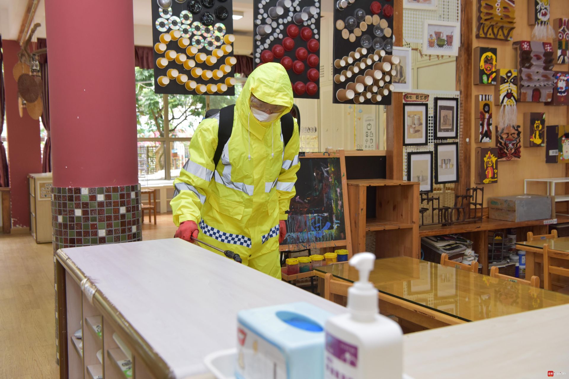 6月1日儿童节,也是深圳市幼儿园有序返园复学的前一天,南山区机关幼儿园里,工人们正在进行返园前的每日常规消杀、检查,保安们则整理着园内前庭广场上的树木枝丫,力争以更加崭新、清洁的面貌迎接返园的孩子们。